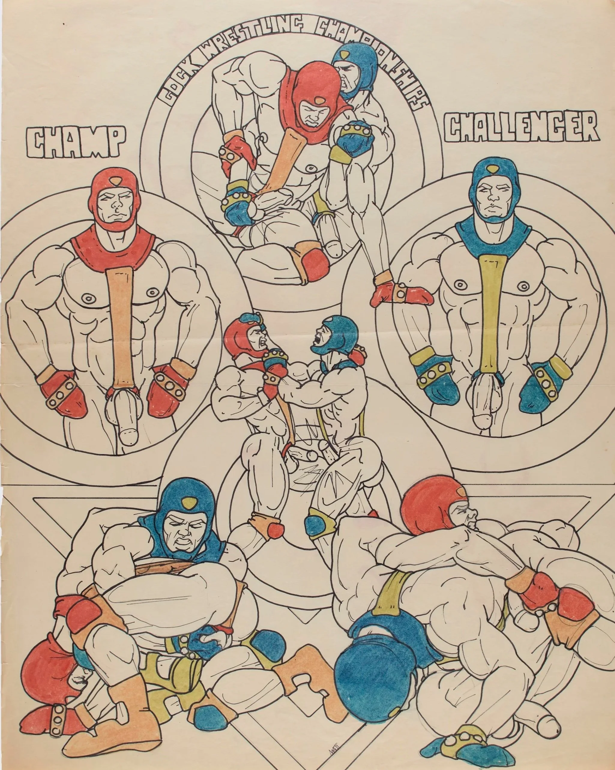 MATT (Charles Kerbs). “Cock Wrestling Championship.” Ink, alcohol marker, and graphite on paper. Offered in AFTER DARK on 11 December 2025.