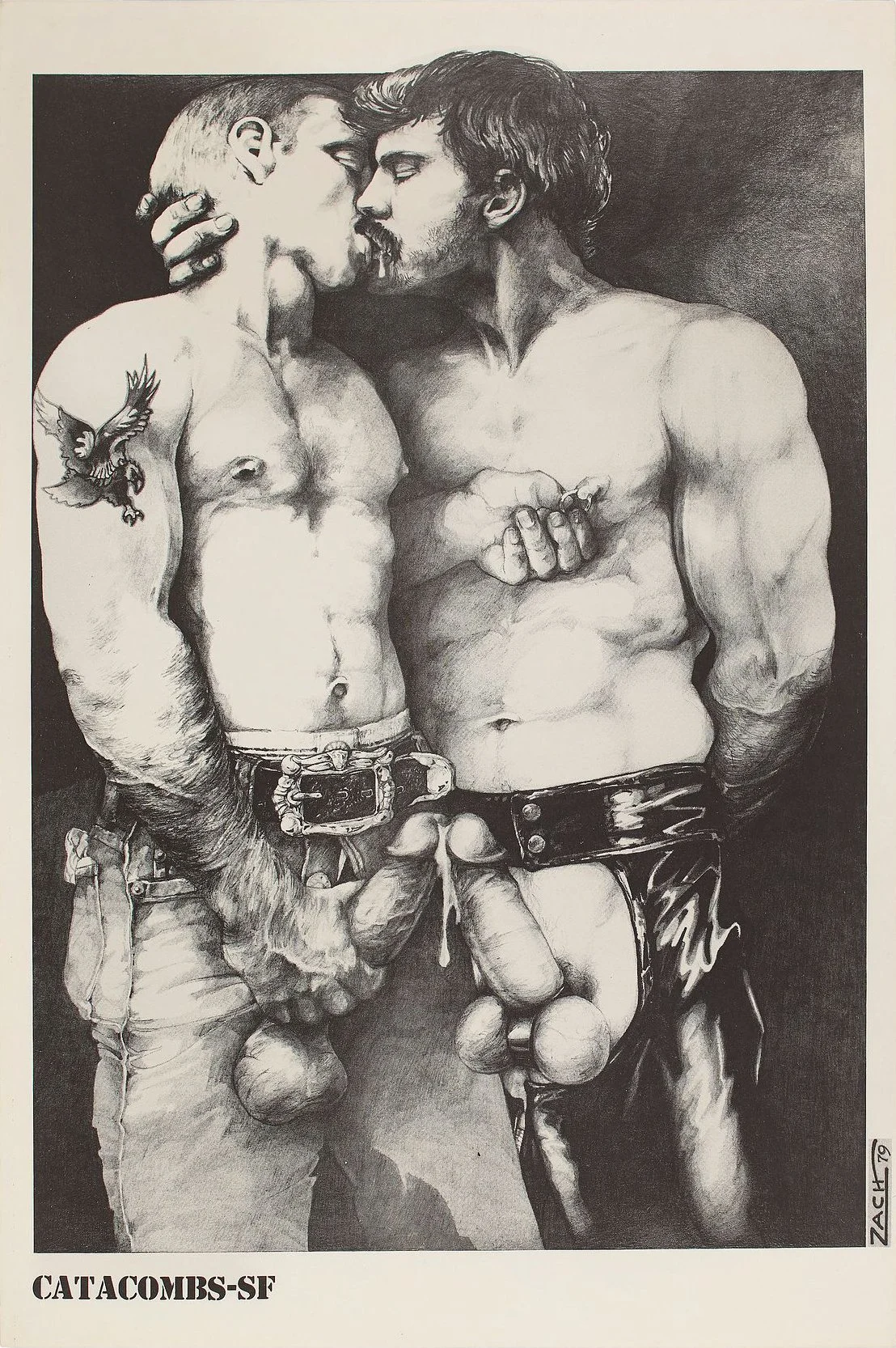 Many of Zach's pieces from the late 1970s and early 1980s were collected by enthusiasts and reproduced as popular posters. Heramb purchased the original pencil drawing and used it to advertise the revived Catacombs at its second location on Shotwell Street. Zach’s posters for venues like the Swap Meet, a popular gay sex club in Los Angeles, further cemented his role in shaping the visual identity of the gay leather scene on the West Coast.